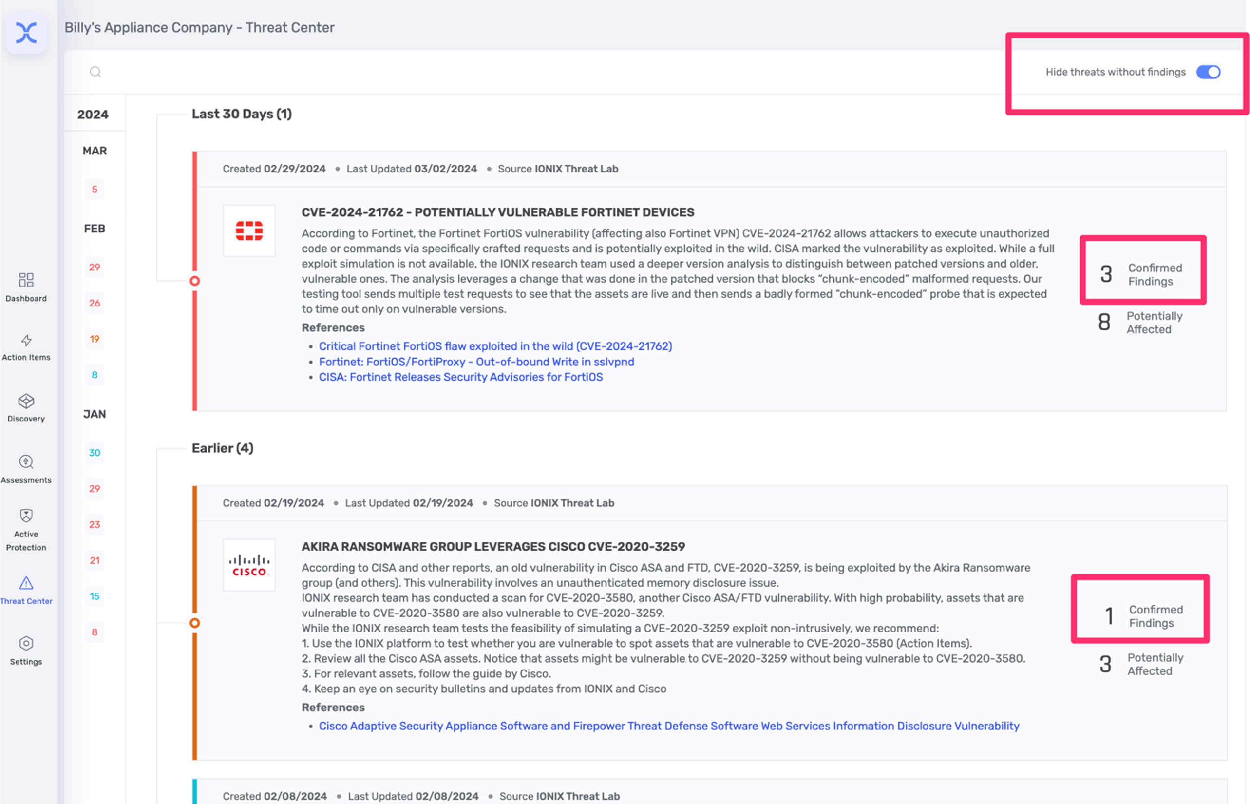 IONIX operationalizes threat intelligence by coupling it with attack surface management. This approach makes threat intelligence actionable by identifying which threats are relevant to your organization's assets and digital supply chain. The IONIX Threat Center provides a filtered list of Zero Day/One Day vulnerabilities that apply specifically to your assets, enabling targeted incident response and prioritization. Read more.